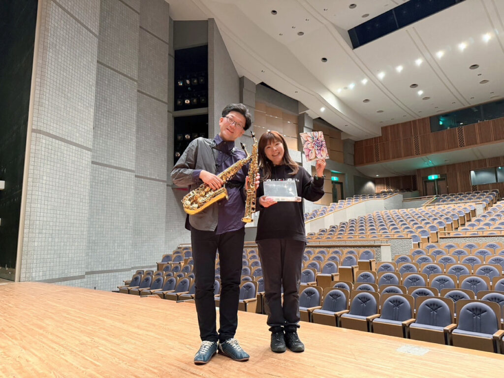 当日、演奏をする1人でもある山下雅也さん(ソプラノサクソフォン)も一緒に。打ち合わせ中に軽く音を聞かせて下さいとお願いしました(*^^*)
