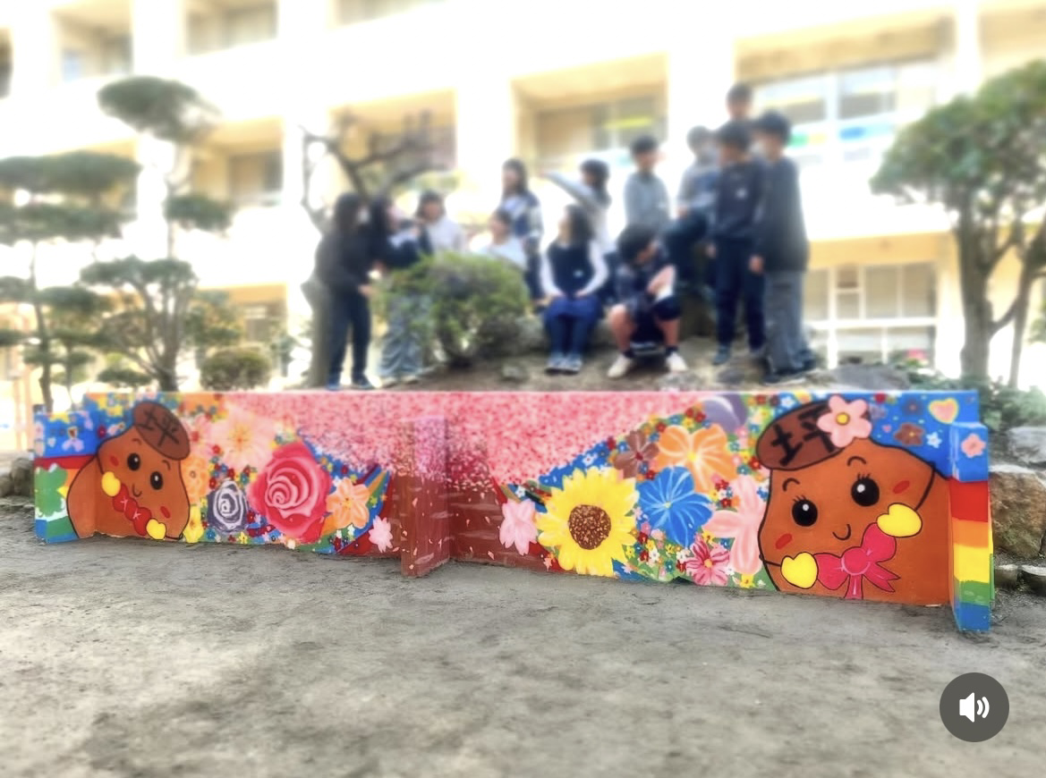 伐採された桜の木をキーホルダーにして児童たちも資金集めから動き始めた姿〜先生との打ち合わせ、壁画のテーマと思いから児童たちと一緒に関わったことで無事、お披露目式を迎えれて私も本当に嬉しかったです。伐採された桜の木をキーホルダーについてと壁アートが担当だった児童たちの制作の様子です。