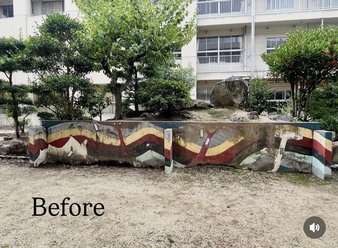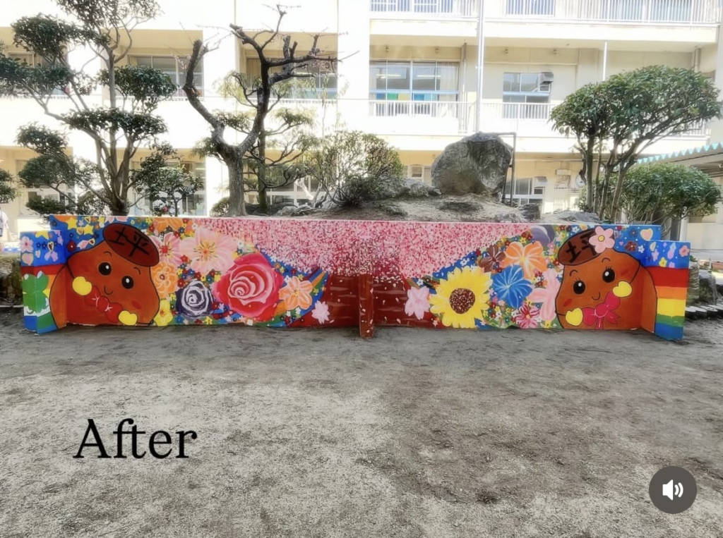 こんなに大きく印象が変わりました。元々は、児童の勉強にもなればと地層を書かれたアートの部分をリニューアルしようと担当の先生より声があり、昨年より児童と先生たちと一緒に進めてきた壁画制作が無事完成できました!ご協力してくれた皆様、ありがとうございました。